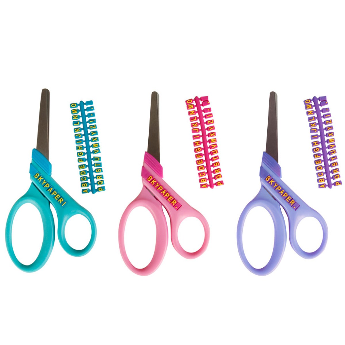 A Tesoura Nome Alfabeto Skypaper é indicada para uso escolar, oferecendo segurança e praticidade com um design educativo.